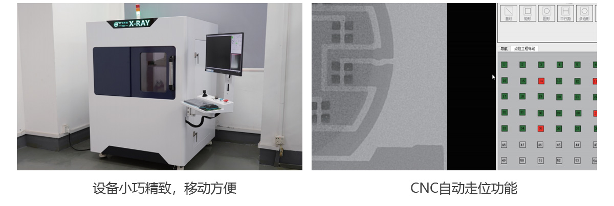 ● X射线源采用进口封闭式X光管,可选配110KV/130KV ● 新一代高清数字平板探测器,淘汰了影像增强器 ● 可倾斜角度:正负60° ● 可选配搭载360度旋转功能 ● 载重小于10KG,600mm*600mm载物台 ● 可CNC编辑检测程序实现大批量自动化检测,自动判断NG或OK ● 操作简单,迅速找到目标缺陷,两小时培训上手 |